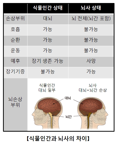 뇌사와 식물인간의 차이도 모두 이 뇌줄기의 손상 여부에 달려 있습니다. 뇌사는 뇌줄기이 회복하지 못할 정도로 손상된 상태이고, 식물인간은 뇌줄기가 제 역할을 하고 있기 때문에 인공호흡기 없이 자발적인 호흡이 가능한 상태를 말합니다.