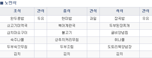 노인들은 노화로 인한 여러 가지 생리기능의 변화와 만성질환으로 인한 식욕부진으로 영양결핍증이 초래될 위험도가 높으므로 적절한 영양상태와 건강 유지를 위해 필요합니다.