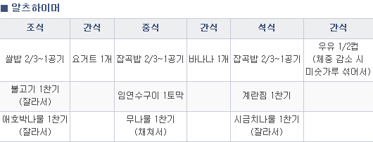 지적 능력의 감퇴와 우울증으로 인하여 식사 섭취량이 감소하는 반면에 행동의 변화로 에너지 소비량이 증가되어 체중감소와 탈수증의 위험이 높고 영양불량이 되기 싶습니다. 반면 말기 단계에 이르면 점차 활동량이 줄어들고 누워지내는 경우가 많아 욕창, 근육위축, 상처회복 지연 등의 문제가 빈발할 수 있어 세심한 영양관리가 필요합니다.